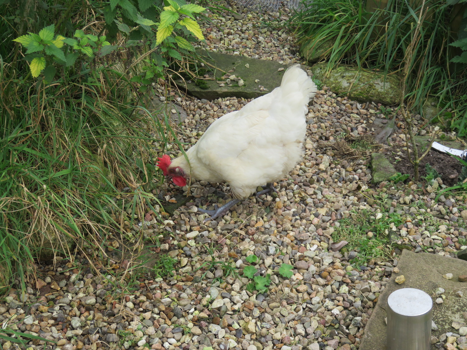 Prillan, das Bresse-Charakterhuhn entwickelt immer mehr charmante Eigenarten, ist zwar in der Herde gut integriert, aber ganz hühneruntypisch gerne für sich und hat als einzige den Dreh raus, im Kiesbett nach Spinnen zu scharren.