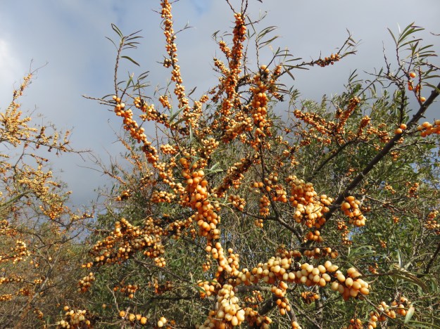 Dieses Sanddorn-Gebüsch habe ich noch nicht beerntet, nur verkostet. Diese überbordende Pracht sollte ich nutzen – wenngleich das nicht ohne Verletzungen abgehen dürfte.