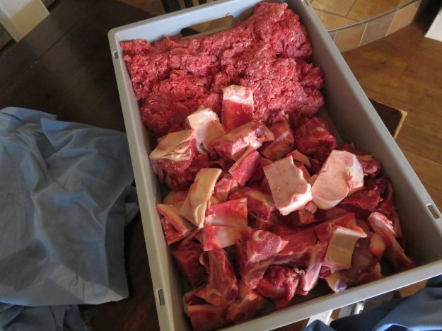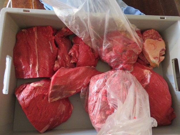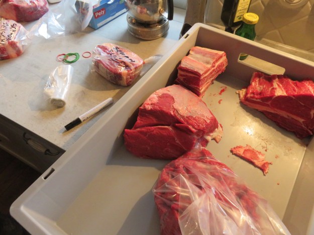 Ebenfalls wie letzten November habe ich unseren Teil eines langsam gewachsenen Weiderinds vom Schlachter geholt. Zuerst von der vorderen Hälfte, eine Woche später von der hinteren Hälfte. In Ruhe gereiftes Fleisch von einem Fleischrind, welches ein gutes Leben mit massenhaft Platz auf einer norddeutschen Koppel anstatt einem argentinischen Feedlot hatte, ist mit nix zu vergleichen. Seht euch nur diese Pracht an!
