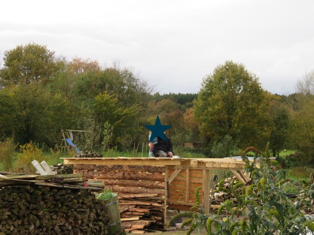 Der Gatte hat mit wechselnden Helfern am Unterstand weitergearbeitet, sollte er irgendwann einmal Zeit finden und das Wetter trocken sein, könnte man Schweißbahn aufbringen, Schotter befestigen und pflastern.