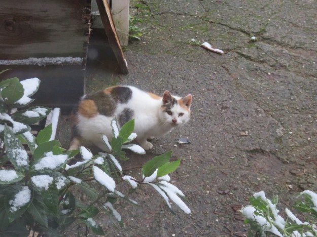 Eine neue Katze ist zugelaufen, hat sich ihren Platz in der Freßordnung des Windfangs erkämpft und bei mir um Toleranz gebuhlt, indem sie voller Vertrauen die Augen schließt, wenn ich sie ansehe. OK, kann bleiben, ist vor allem auch eine Glückskatze und wenn ich mich recht entsinne, begegneten wir uns im Sommer im Nachbardorf, als sie mir vor’s Auto lief und ich ihr riet, lieber bei uns einzuziehen und sich im Mäusefang zu üben.