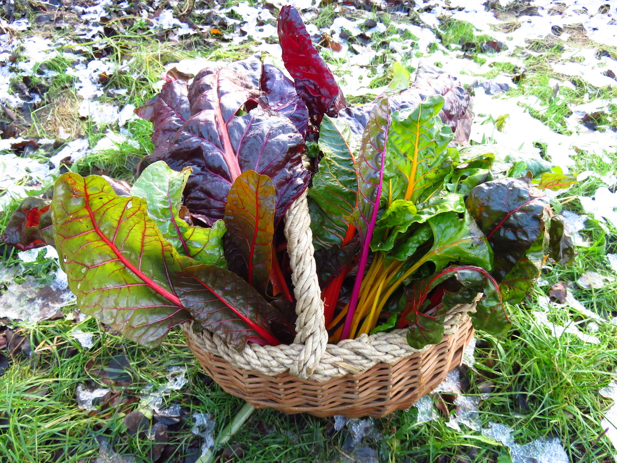 Der bunte Mangold ‚Bright Lights‚ hat den Frost ziemlich gut überstanden, das kannte ich bislang nur von ‚Lukullus‚ und siehe da: der oft als ach so empfindlich bezeichnete Stangensellerie (Giant Pascal) kann auch ein bisschen Frost und Schneebedeckung ab.