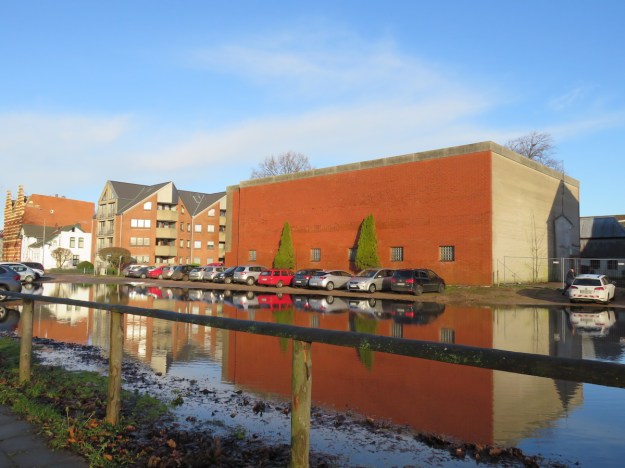 Wie fatalistisch der echte Norddeutsche mit den Wassermassen umgeht kann man schön auf diesem Foto sehen. Es zeigt einen Parkplatz mitten im Zentrum von Heide, wo auf dem größten Marktplatz Deutschlands ein Weihnachtsmarkt ganz ohne Betonpoller und Maschinengewehre, aber dafür mit … jeder Menge Wasser (und ausnahmsweise auch mal strahlendem Sonnenschein) stattfand.