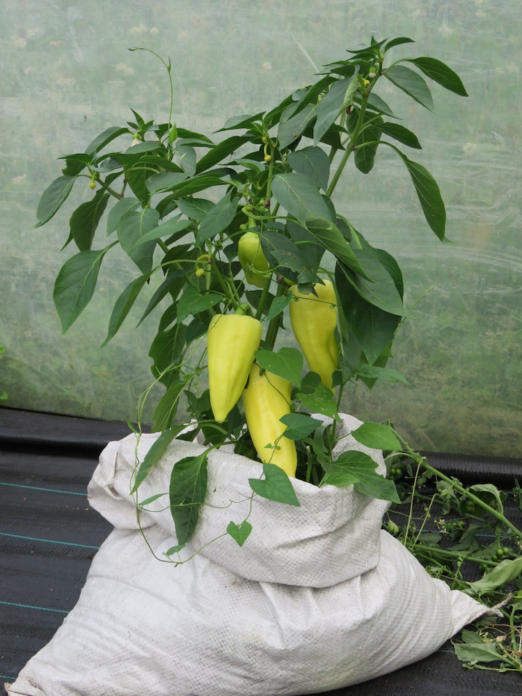 Mehr als scheitern kann man nicht und was man nicht testet, weiss man nie aus eigener Erfahrung: also wurden auf dem Markt Jungpflanzen gekauft – was normalerweise nicht meine erste Wahl wäre, ich ziehe selber vor, aber dafür war es mit Ende Mai zu spät im Jahr – und testweise in Earth Bags angebaut.