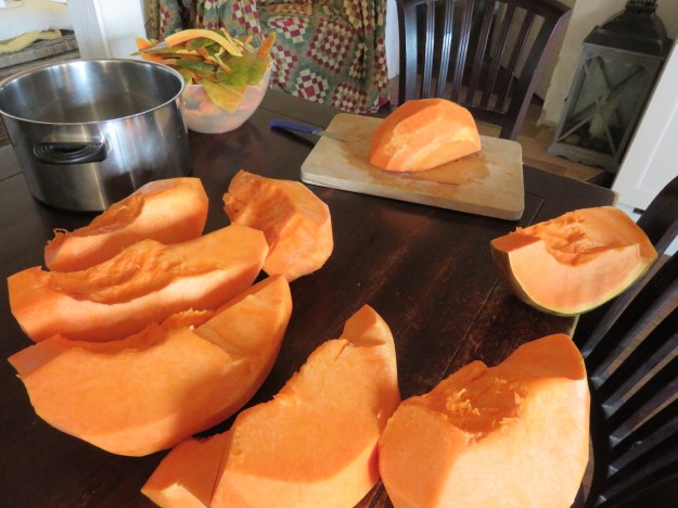 Kürbisse sind ein wunderbares Lagergemüse für den Winter aber leider haben nicht alle Sorten gleich viel Durchhaltevermögen. Während der altbewährte Hokkaido sich bei uns im ungeheizten Eingangsflur des Altbaus bis ins Frühjahr hält, zeigte der Moschuskürbis zum Jahreswechsel erste Verfallserscheinungen. Ich schlachtete ihn an einem kühlen, arbeitsreichen Tag, an dem wir hier Helfer und Besuch auf dem Hof hatten.