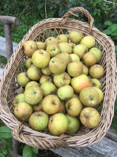Ich hatte passenderweise just einen Korb voll Äpfel der Sorte ‚Dr. Seeligs Orangenpepping‘ geerntet, der als Hochstamm auf der kleinen Streuobstwiese am Entenstall steht. Ein toller Apfel, sehr fest, aromatisch und ausgewogen süß-säuerlich.