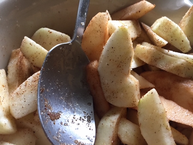Äpfel schälen, in Spalten schneiden und reichlich mit Zimtzucker bestäuben.
