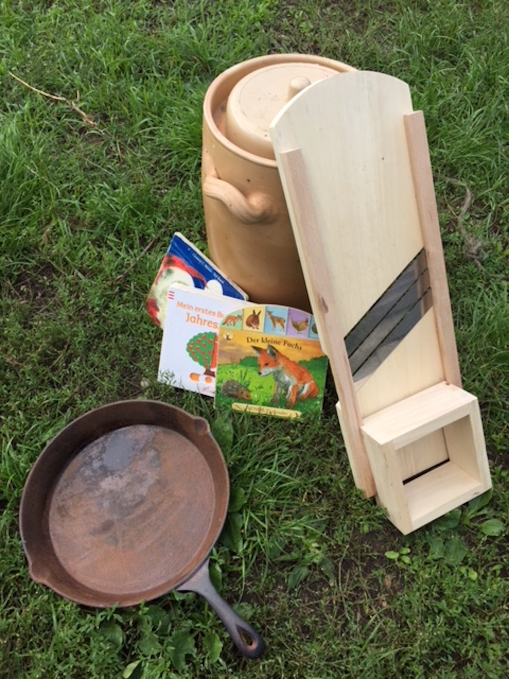 Auch von der Flohmarkt-Saison konnten wir noch einen kleinen Teil erleben, endlich war es nicht mehr zu heiß und das Baby alt genug für ein kurzes Eintauchen in die Menge. Bei diesen Gelegenheiten wird uns immer stark bewusst, wie sehr sich die Gesellschaft verändert hat und dass wir eigentlich zur falschen Zeit geboren sind. Immerhin konnten wir einige Schnäppchen machen und Beute nach Hause schleppen. Über die Reinigung der verrosteten gußeisernen Pfanne hatte ich hier berichtet.