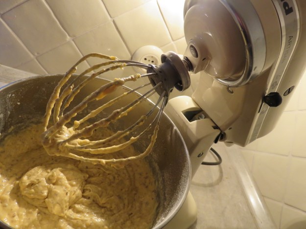 Stück für Stück die gemischten trockenen Zutaten unterrühren und zwischendurch immer soviel Milch zugeben, dass sich alles gut verbinden kann. Die Konsistenz soll am Ende cremig sein und der Teig darf sich zäh in die Form kippen lassen.