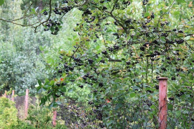 Zuvor aber, als ich noch in Tschechien weilte, war eine noch gigantischere Apfelbeere meine Gartennachbarin (siehe Foto oben). Eines habe ich auch retrospektiv beim Betrachten der alten Fotos festgestellt: dort auf dem Berg, mitten in den Wäldern Ost-Tschechiens, da gab es schon sehr vieles von dem, was ich erst durch intensivere Beschäftigung mit Gärtnerei, mehrjährigen Nutzpflanzen und Permakultur kennenlernte. Berberitzen, essbare Ölweide in über 5m Höhe und stattlichem Alter, Aronia, Mahonie, ein Erdgewächshaus mit schwarzen Wassertonnen als Wärmespeicher, einer geweisselten Rückwand zur Reflektion der Sonnenstrahlen mit Weinreben davor und ein Feigenbaum daneben im Gewächshaus. Einen Erdkeller, ein Kompostklo, Streuobstwiesen mit Hochstämmen in verschiedenen Arten und Sorten, Bienentrachtpflanzen und vieles mehr.