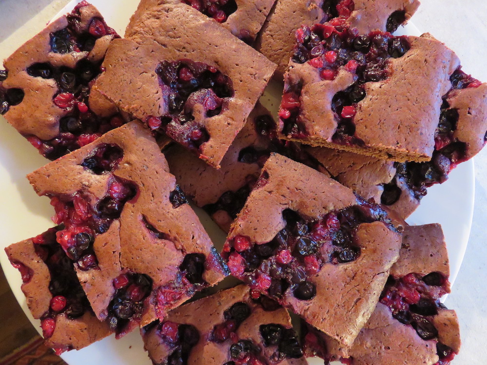 Ein Backblech mit Öl einpinseln oder mit Backpapier auslegen, den Teig darauf gleichmässig verteilen und glatt streichen, die Johannisbeeren darauf verteilen. Für etwa 30 Minuten backen, dann etwas abkühlen lassen, schneiden und vom Blech nehmen.