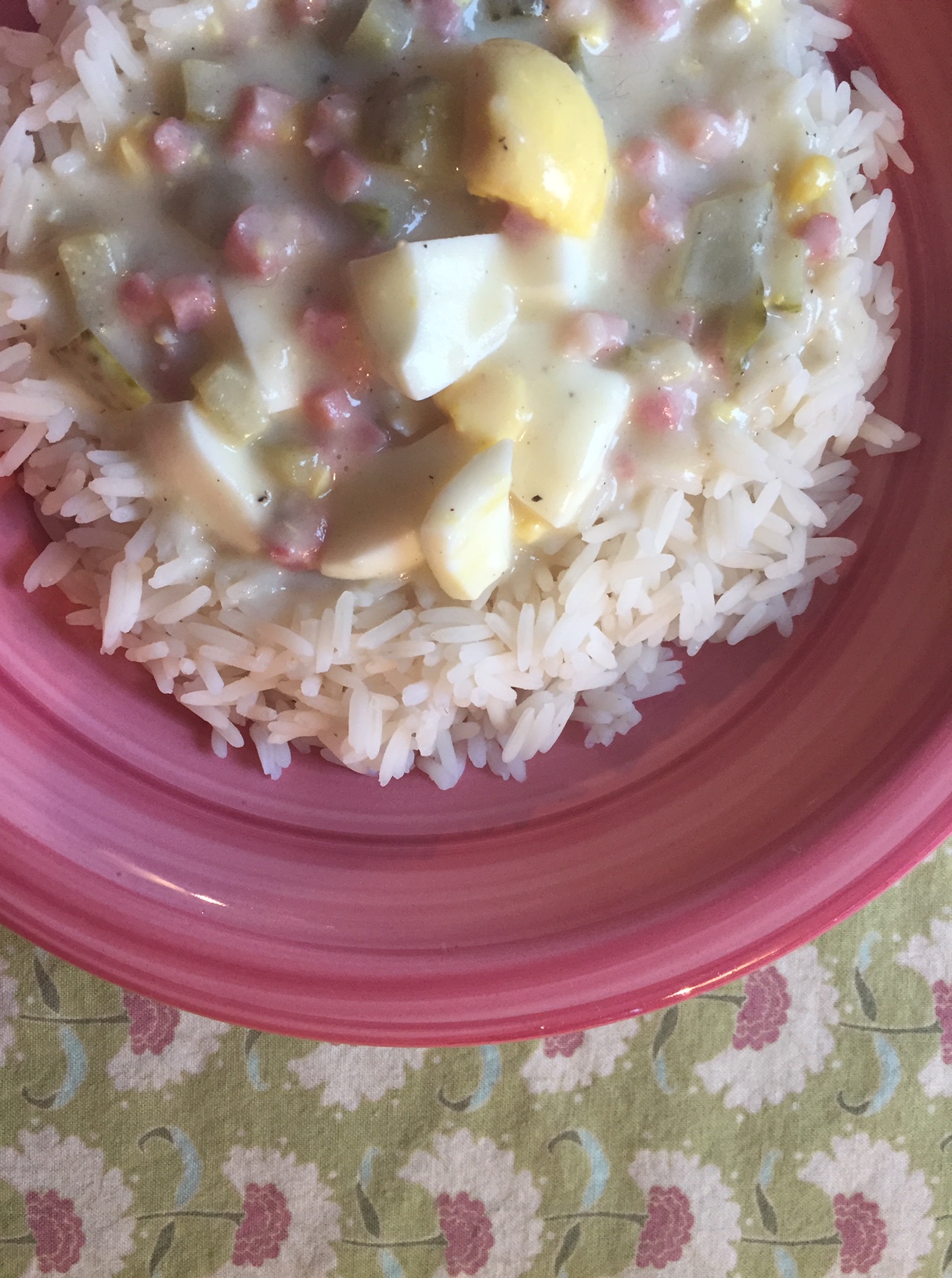 Alles klar? Tja, schnell gemacht, Zutaten im Wesentlichen aus der Speisekammer, ein Rezept für den Spätwinter und das Frühjahr wenn die Eierschwemme einsetzt und man aus dem Garten noch nichts ernten kann aber noch Konserven wie Schinken, saure Gurken und Reis hat. Sahne und Eier hatten und haben die Bauern sowieso. Ich verorte das Rezept direkt in die Zeit der hungry gap und das macht es für mich natürlich interessant.
