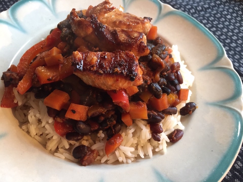 Schwarze Bohnen, Reis, Hühnchen mit Tamari
