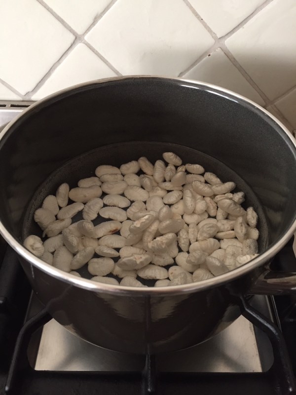 Die Kochzeit beträgt etwa 90 Minuten, gegen Ende würde ich ab und an testen, ob die Bohnen nicht zu weich werden. Sobald sie die richtige Konsistenz haben, abgiessen und mit kaltem Wasser runterkühlen.