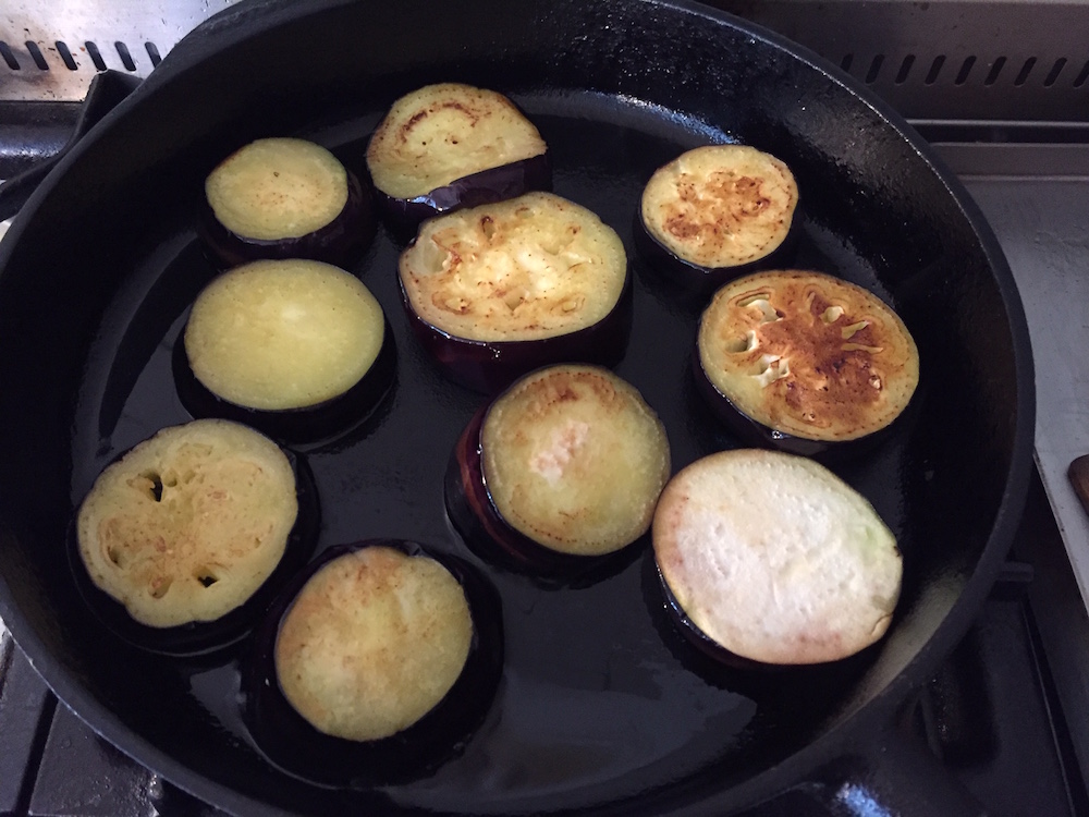 Das Wasser abtupfen und die Auberginenscheiben nach und nach in Olivenöl scharf anbraten bis sie goldgelb sind. Da Auberginen viel Öl brauchen, muss man dieses zwischendurch immer mal nachfüllen. Im Originalrezept wurden nur 100ml Olivenöl benutzt, mir ist schleierhaft, wie man das schafft und habe wahrscheinlich 300ml gebraucht.