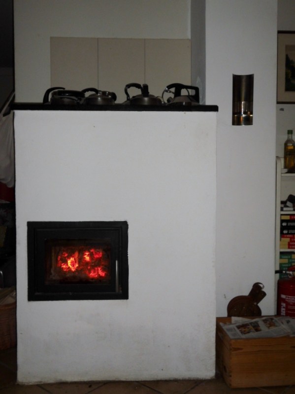Das Heizen: Ein Grundofen hält zwar lange die Wärme – aber um warm zu werden, braucht meiner jedenfalls 3 Stunden. Und mit einmal anheizen ist auch bei meinem Grundofen bei diesen Temperaturen nichts gewonnen. Mein Ofenbauer ermunterte mich, dann immer aufzulegen und wenn es 3 oder 4 mal ist. Das mache ich auch. Und bevor es in die Nachtruhe geht, wird noch einmal ein Gluthalter (ja, so was gibt es – es sind Rindenbriketts) aufgelegt und sobald die Flammen nur noch glühen, die Luftzufuhr auf nur noch 1/3 heruntergeregelt.