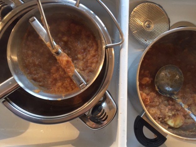Ist der Teller ringsum voll mit dem matschigen Fruchtfleisch, ertaste ich die Kerne mit den Fingern, löse das Fruchtfleisch zwischen Fingern und verwerfe die Kerne. Das pure Fruchtfleisch wandert in einen Kochtopf. Die Methode hört sich komplizierter an als sie ist. Wie gesagt: wirklich schnell und unkompliziert ist keine mir bekannte Methode. Man kann die halbierten Mispeln auch durch ein Haarsieb aus Metall streichen, ein jeder sollte für sich ausprobieren, mit welcher Methode man die beste Ausbeute und den geringsten Streß hat.