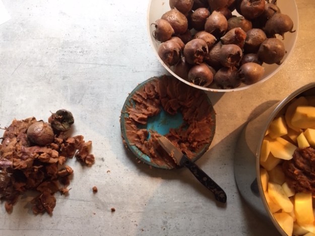 - 1kg Mispeln, gereift und fermentiert (auf Druck müssen sie nachgiebig sein, das Fruchtfleisch weich)