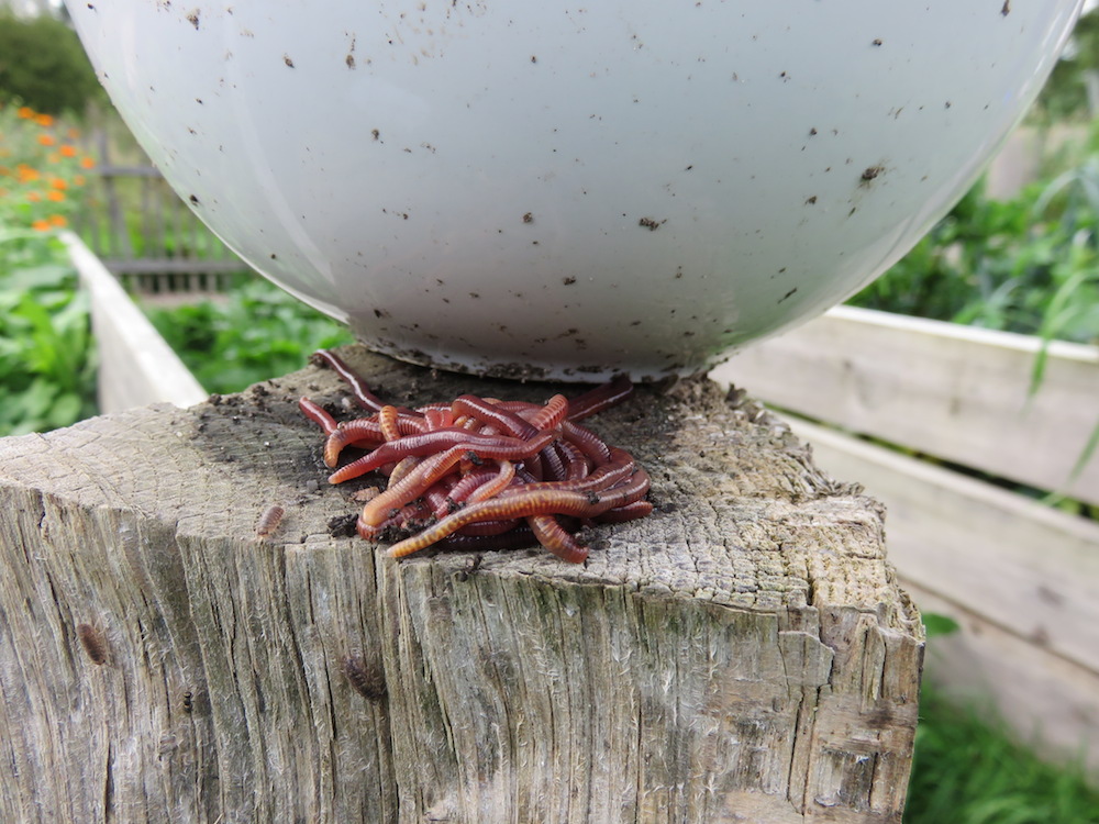 Im Internet gibt es so lustige Dinge wie ‚Anleitungen zum Ernten von Kompostwürmern‘. Hier bei uns im Hochbeetgarten finden wir ganz praktisch heraus, wie man größere Mengen Kompostwürmer ohne Erde, Kompost und sonstigen Ballast zusammenrotten kann.