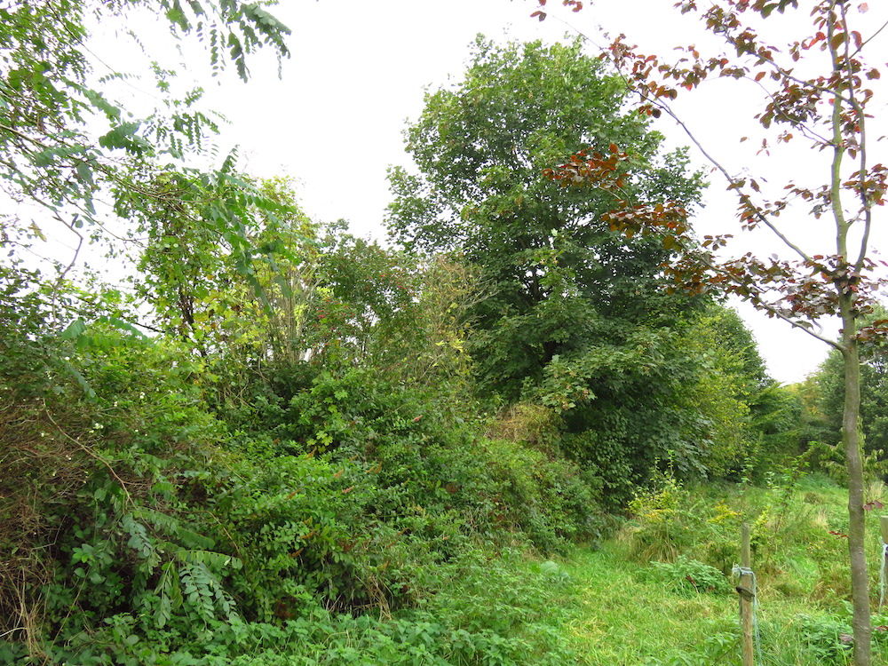 Mittlere Seite der linken Grundstückseite; hier mischen sich die nicht-einheimischen Ziergehölze der Nachbarn mit den klassischen Knickgehölzen