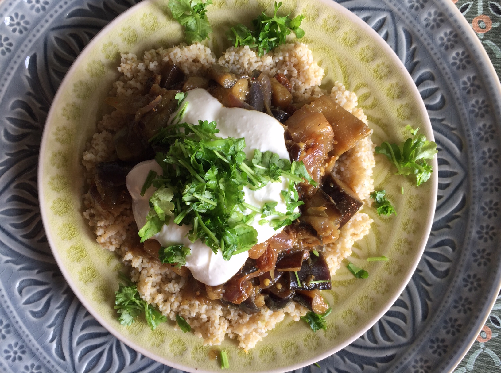 Gebratene, würzige Auberginen mit Bulgur und saurer Sahne :: باذنجان مقلي مبهر مع البرغل والقشدة الحامضة