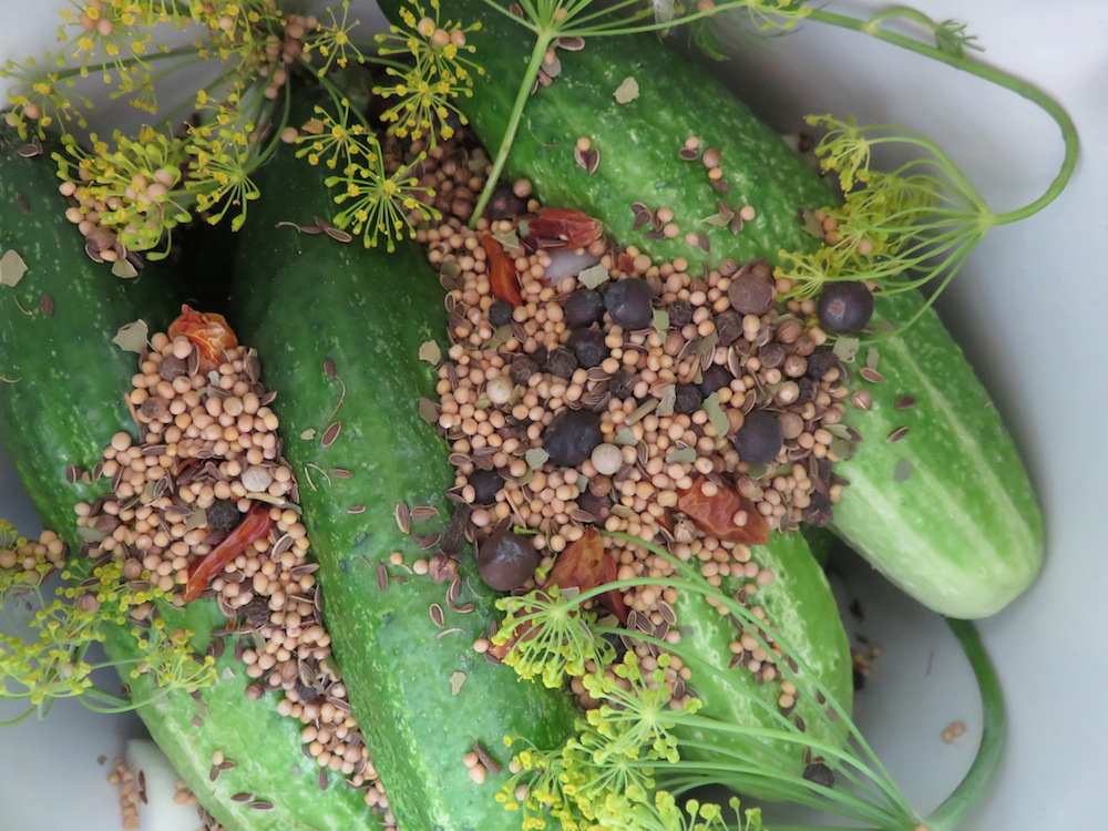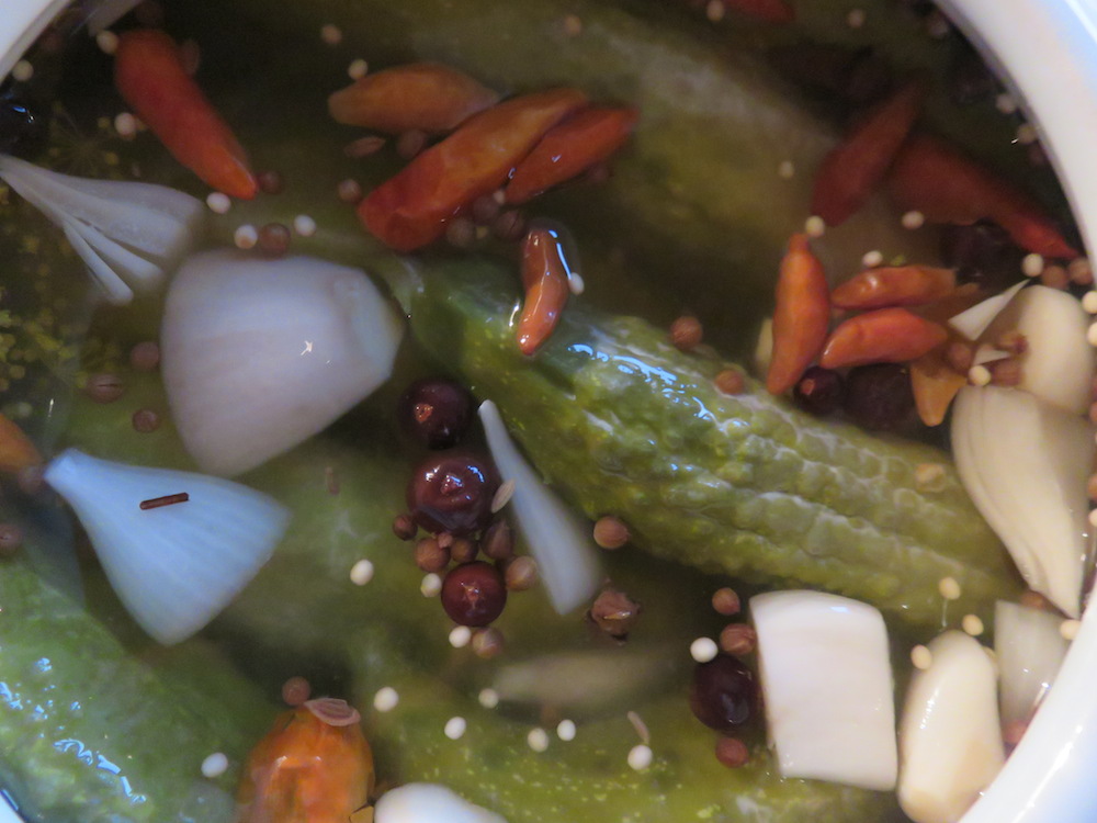 Die Gewürzmischung für die Gurken kann natürlich nach Belieben variiert werden; ich bevorzuge scharfe Chili-Gurken, die bessere Hälfte Knoblauchgurken.