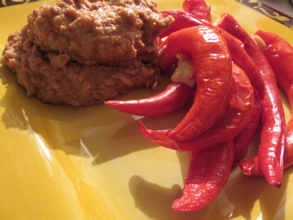 Mit Ziegenkäse gefüllte Pimientos und mexikanisches Bohnenmus