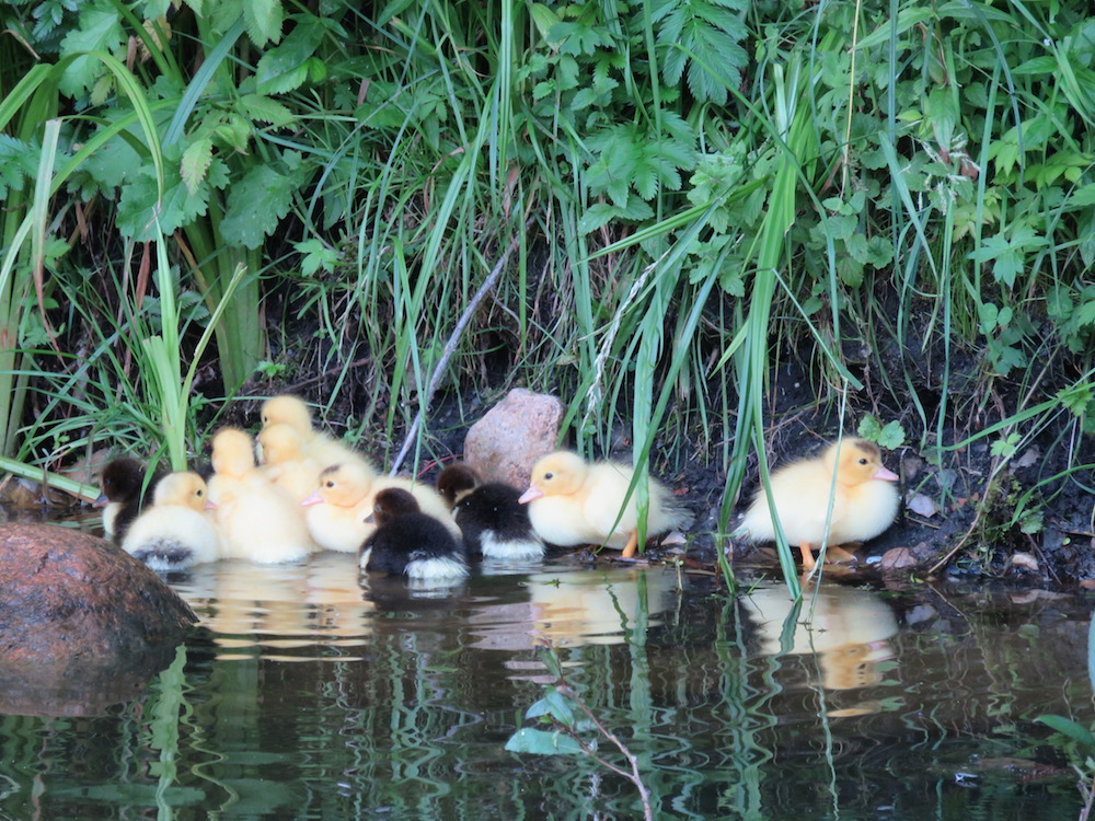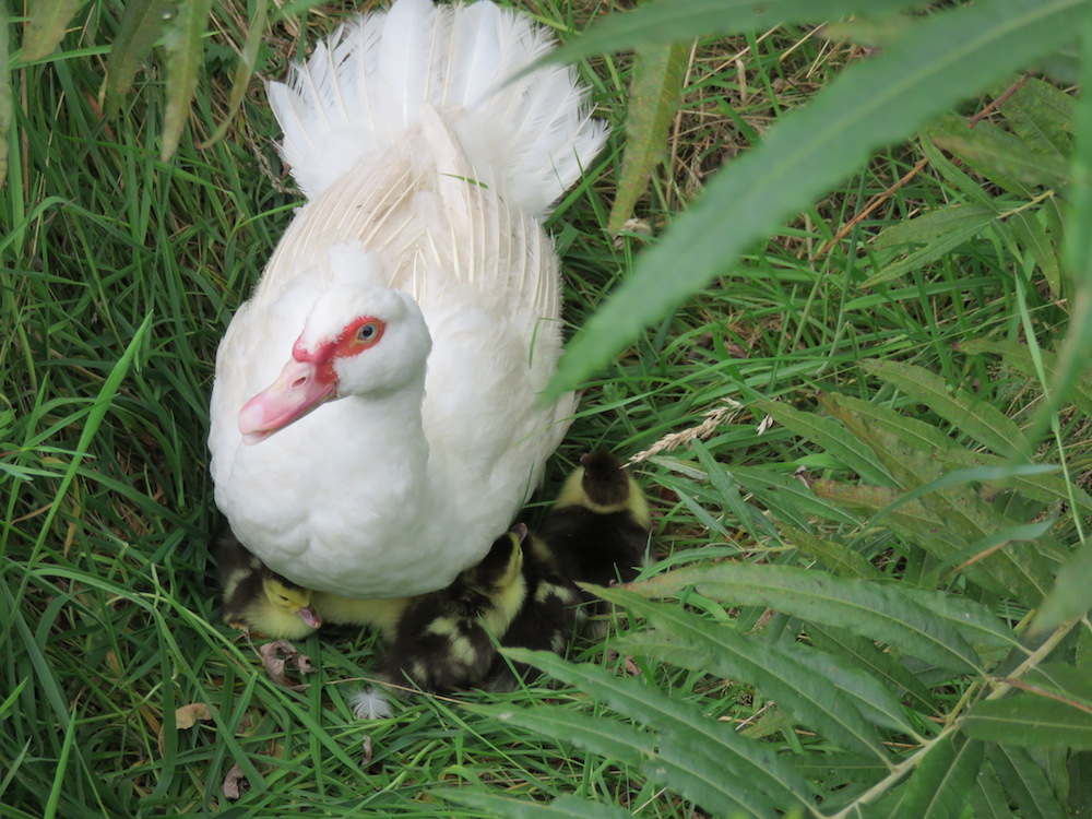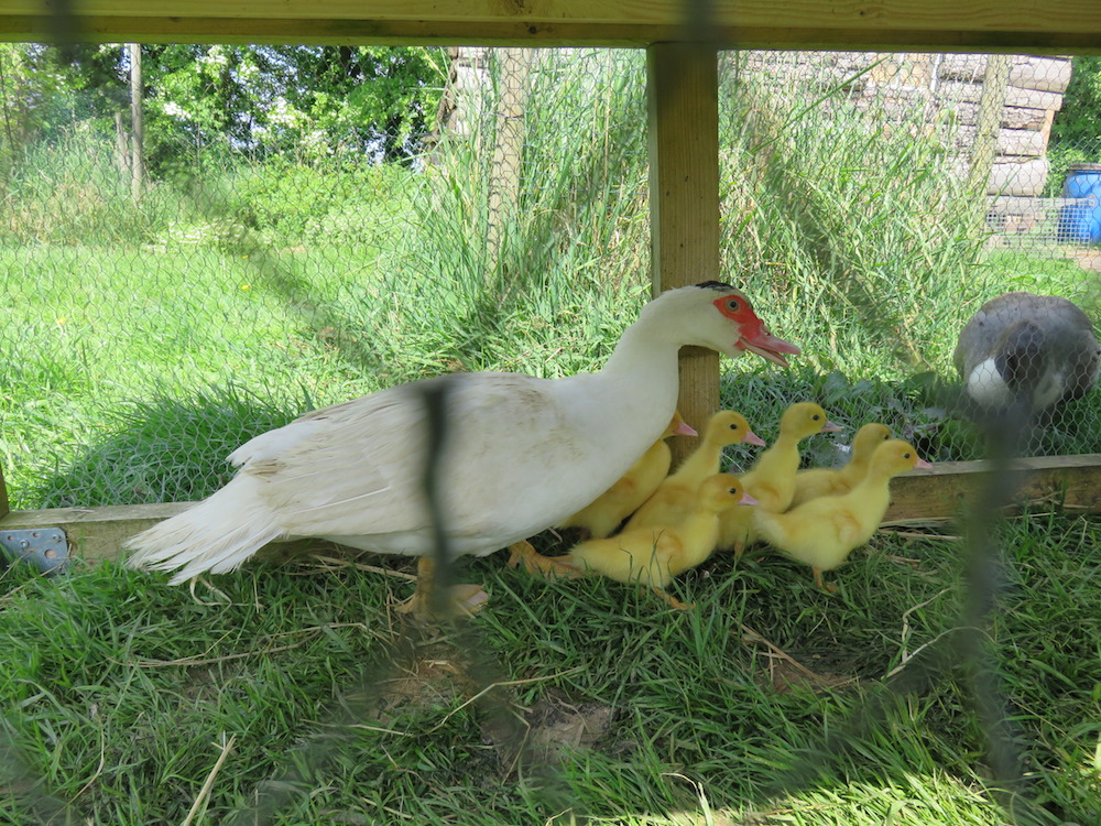Diese Flugente mit ihren 6 Küken kam letztes Wochenende zu uns und zog in eine frisch gezimmerte Mutter-Kind-Einheit, die Schutz vor den allgegenwärtigen Krähen bietet. Sie stammt von einem Bauernhof mit Schweinen, Fleischrindern, Schafen, Hühnern und Enten vielerlei Couleur. Wir haben im Rahmen des ständigen Geflügeltausches, Bruteier von Bresse-Hühnern (Gauloises Blanches) einer dort wohnenden Glucke untergelegt und wenn man schon Geflügelhalter besucht, geht es natürlich fast nie ohne Geschacher und Getausche.