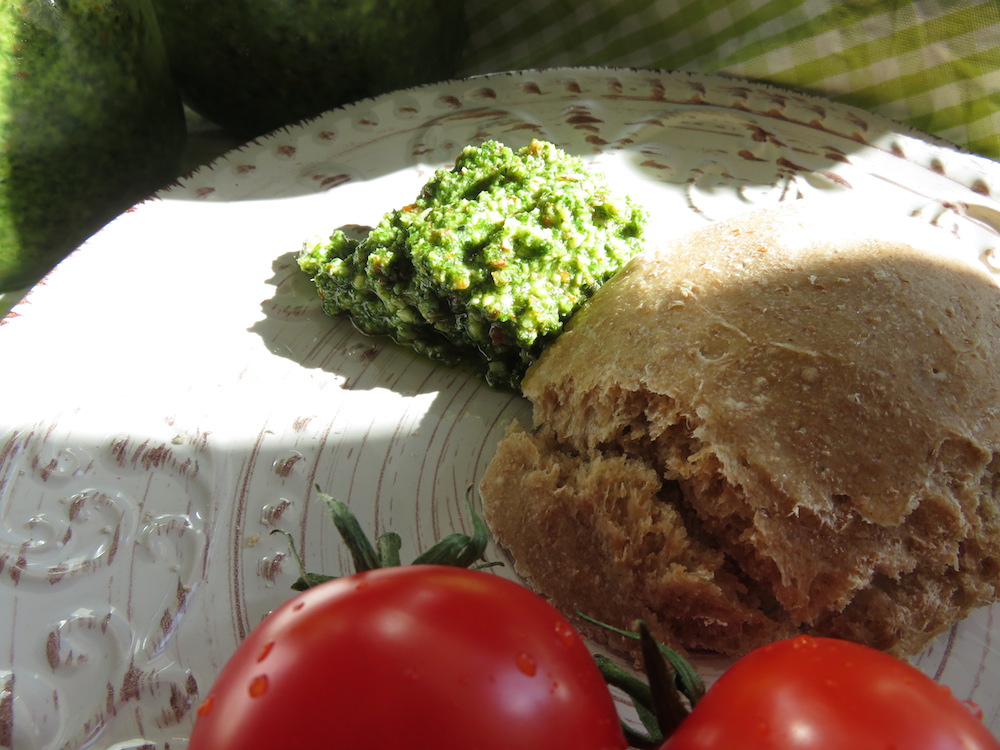 Wie bereits erwähnt, habe ich aus den feinen, zarten Rettichblättern, die beim Kkakdugi machen übrig geblieben sind, Rettichblätter-Pesto hergestellt.