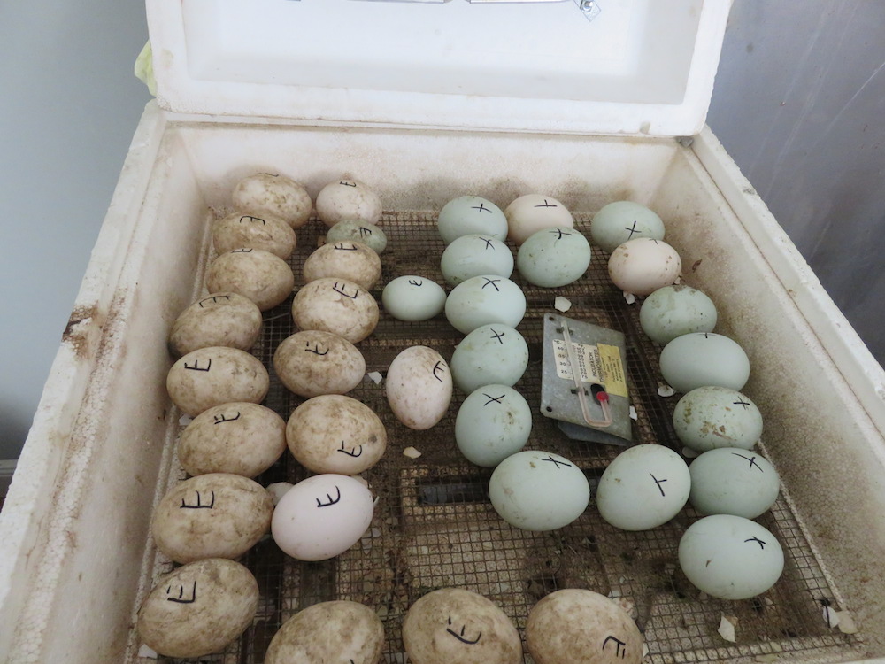 Diese Flugente mit ihren 6 Küken kam letztes Wochenende zu uns und zog in eine frisch gezimmerte Mutter-Kind-Einheit, die Schutz vor den allgegenwärtigen Krähen bietet. Sie stammt von einem Bauernhof mit Schweinen, Fleischrindern, Schafen, Hühnern und Enten vielerlei Couleur. Wir haben im Rahmen des ständigen Geflügeltausches, Bruteier von Bresse-Hühnern (Gauloises Blanches) einer dort wohnenden Glucke untergelegt und wenn man schon Geflügelhalter besucht, geht es natürlich fast nie ohne Geschacher und Getausche.