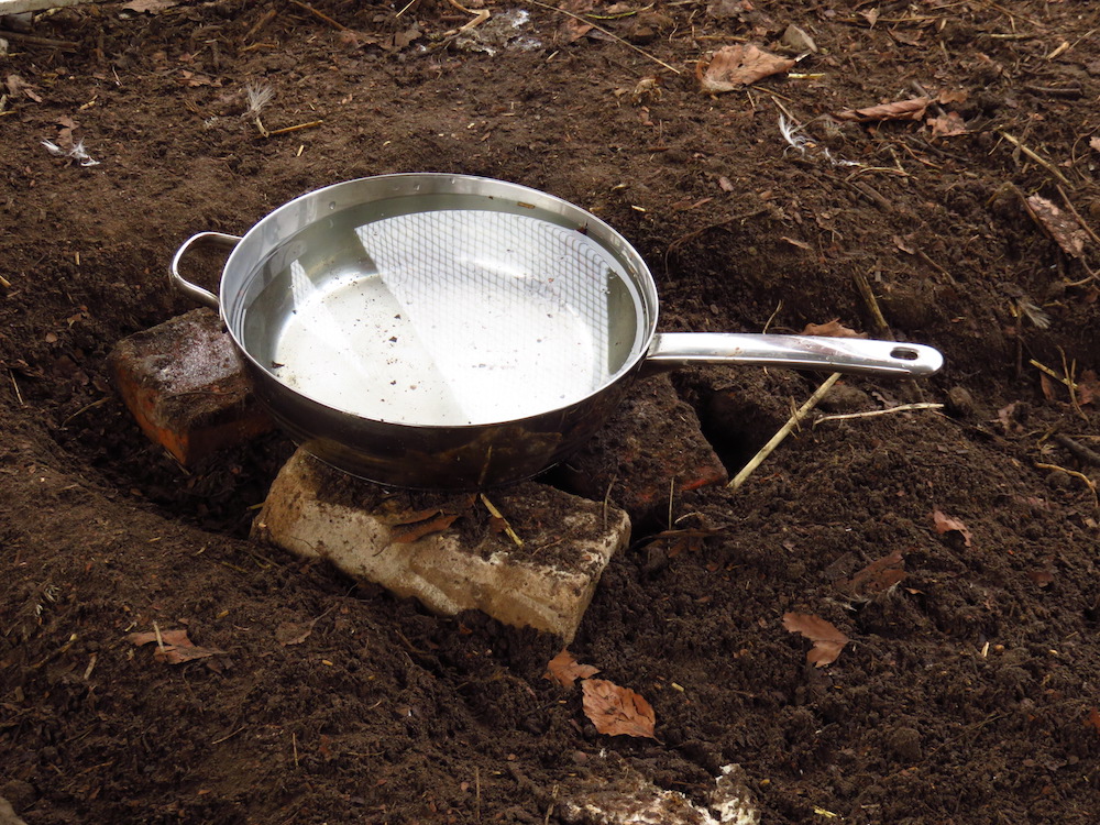Neulich auf dem Flohmarkt entdeckte ich eine stark verrostete, gusseiserne Pfanne, die perfekt für die Feuerstelle geeignet ist. Perfekt deswegen, weil sie – anders als die meisten in Deutschland erhältlichen Gußpfannen – keinen Holzgriff hat, sondern einen integrierten Metallgriff.